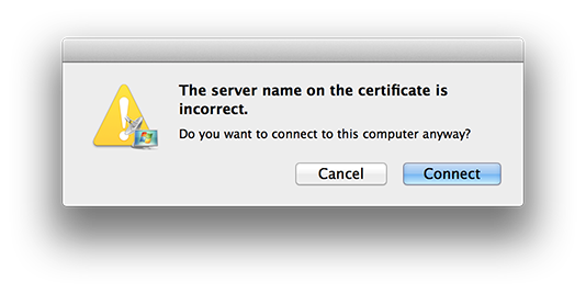 You might see a warning like the one below, “The server name on the certificate is incorrect.” This is OK, and usually means that you are connecting directly to the virtual server’s IP address (rather than hostname), or your local computer does not have the remote certificate downloaded (not required). It’s OK to continue.