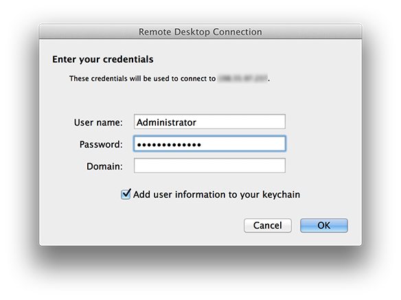 At the next prompt, enter your server login information. The username is often “Administrator”, and you can leave the ‘Domain’ field empty in most cases.