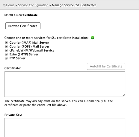 In this guide, we will show you how to install a valid, commercially-signed SSL certificate on a cPanel/WHM server. This will provide verified security for cPanel services like the cPanel user login portal, WHM admin login portal, Webmail, and FTP.
